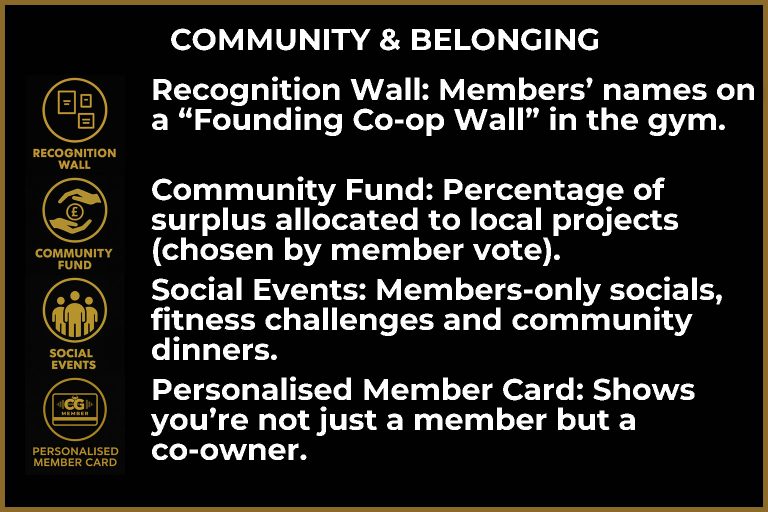 • Recognition Wall – members’ names on a “Founding Co-op Wall” in the gym.