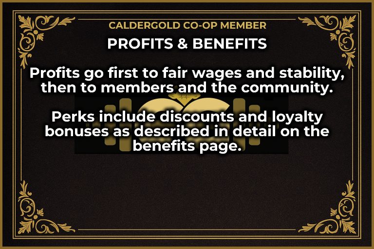 • Own a share of any profits generated (profits go first to fair wages and stability, then to members and the community).